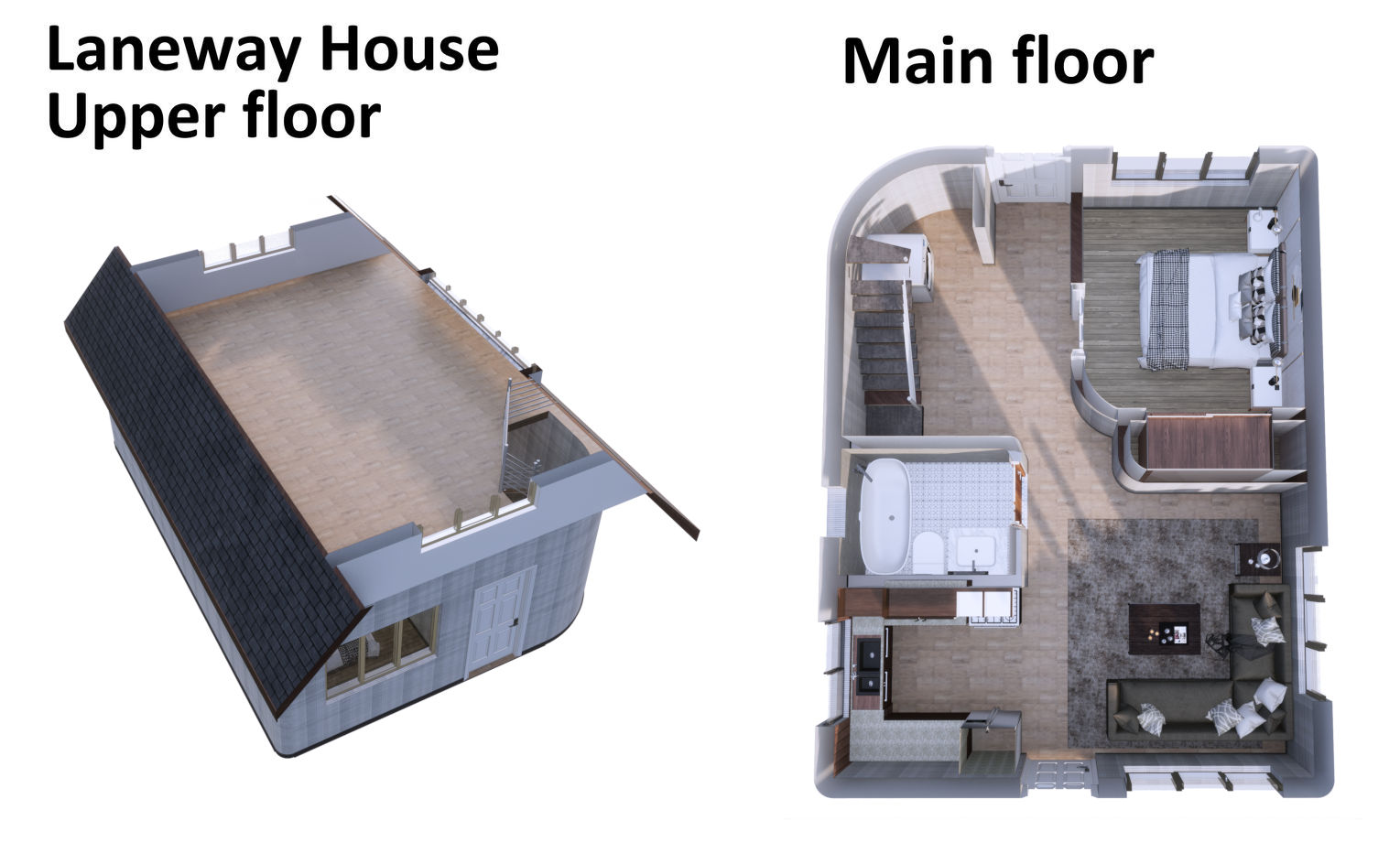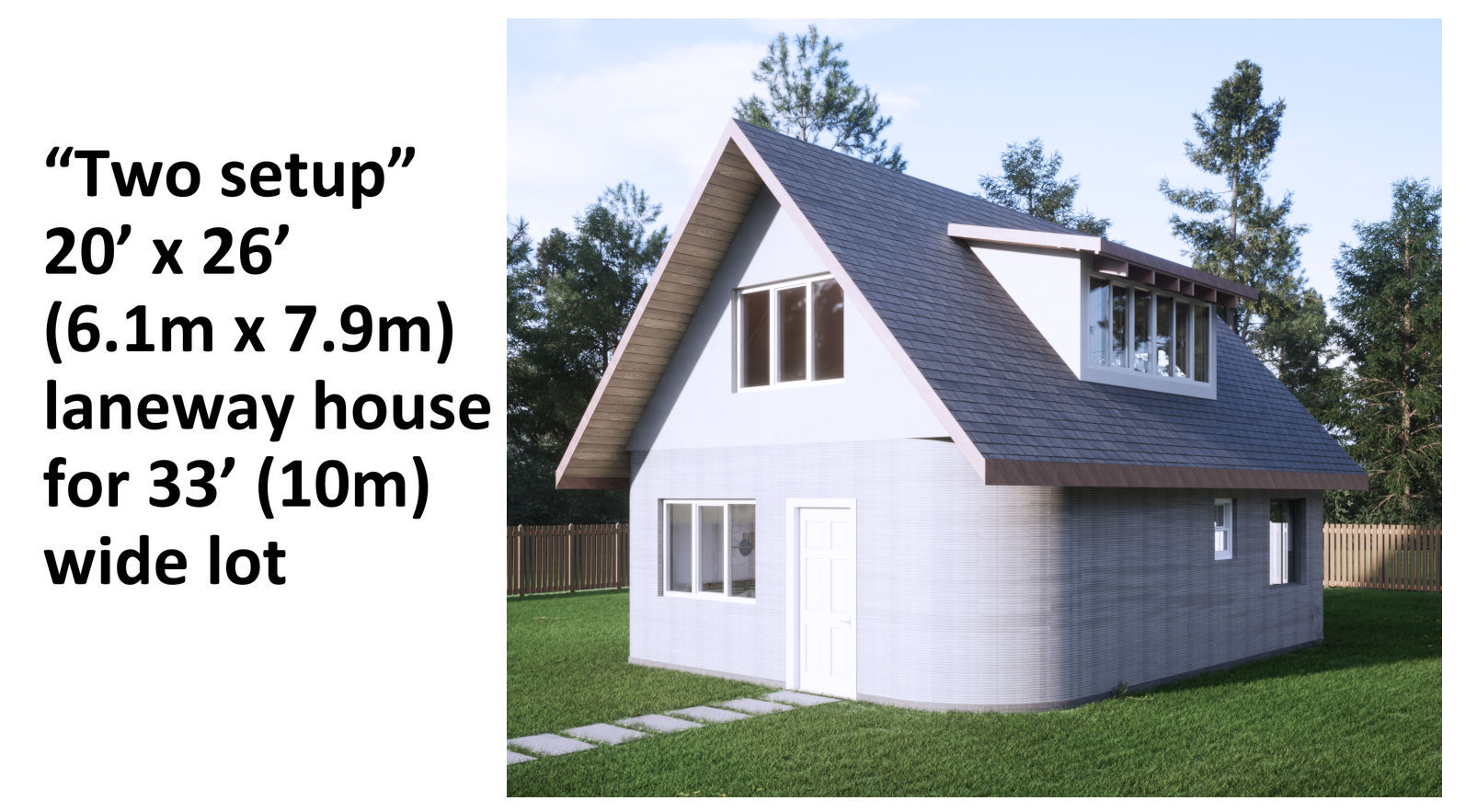 The Laneway House drawing below shows a 3D-printed 1.5 storey house that meets these requirements.